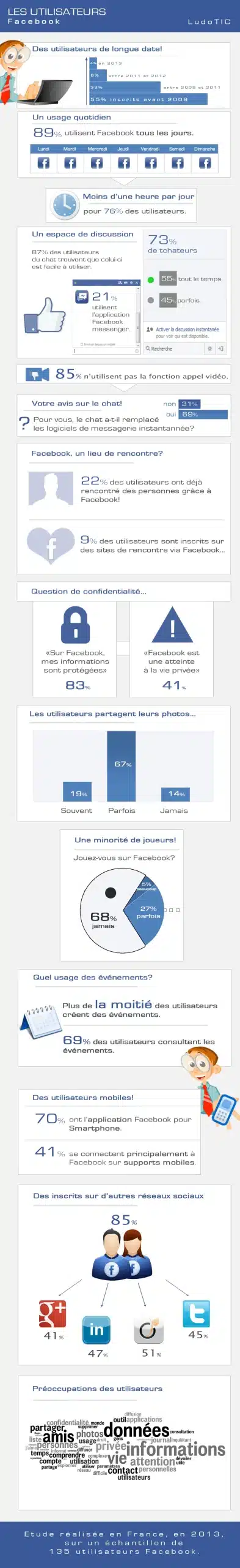 Dans ce contexte, LudoTIC a souhaité recueillir les usages et les avis des utilisateurs français. Une étude a été réalisée par questionnaire sur un échantillon de 135 personnes utilisant Facebook. Les principaux résultats vous sont présentés dans cette infographie et dans l’article qui suit.