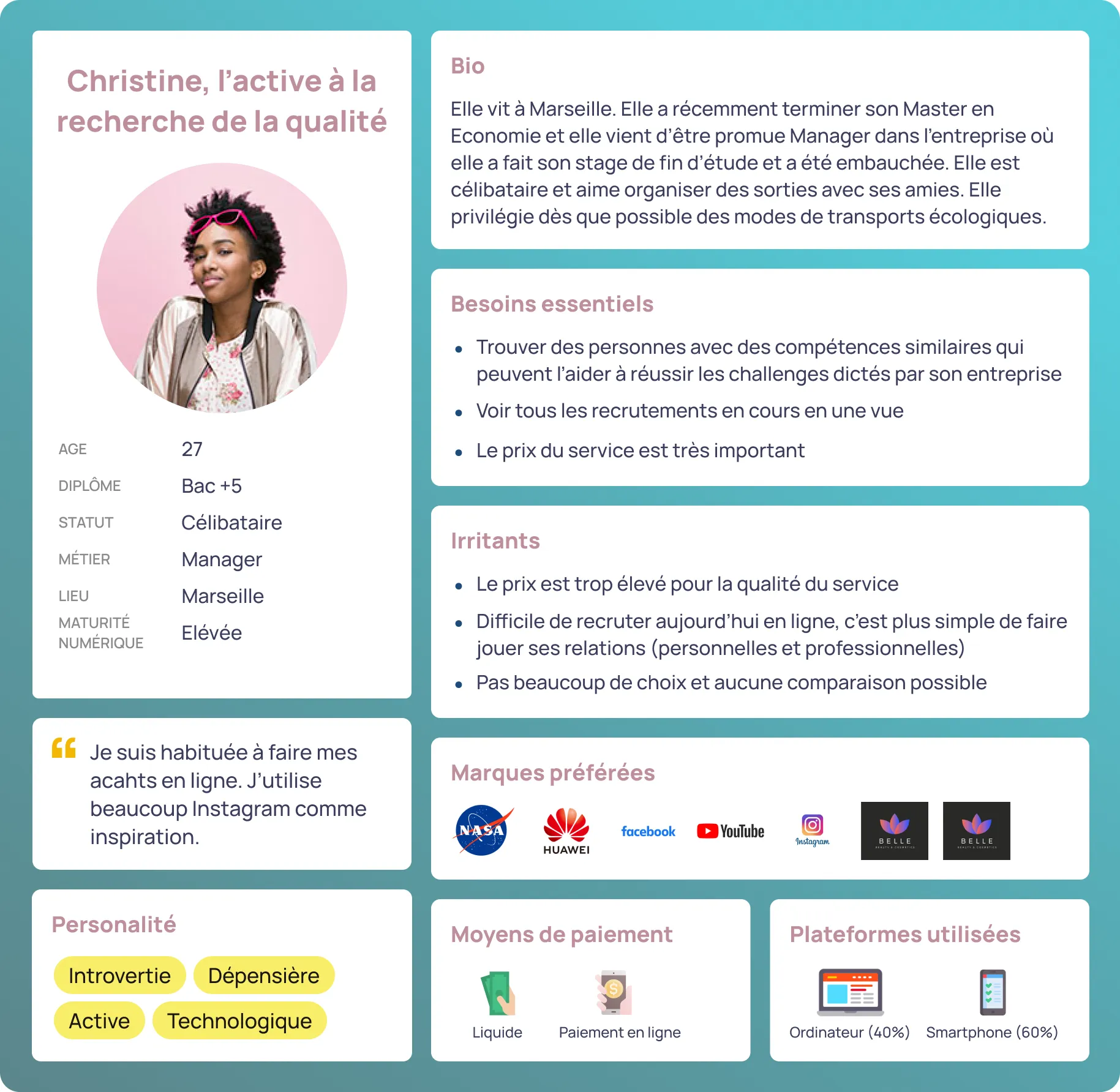 Le persona est un outil indispensable pour comprendre qui sont les utilisateurs, comment ils agissent et quels sont leurs irritants et connaissances en général. Ici, il s’agit d’un persona complètement fictif.